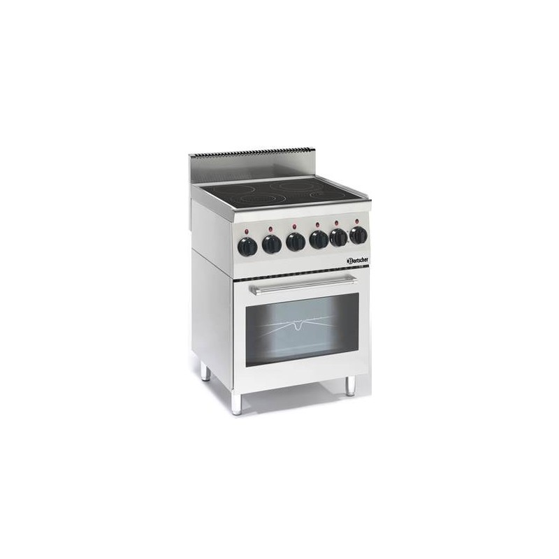 Fourneau vitrocéramique à 4 zones radiantesavec four électrique multifonctionDimensions : L 600 x P 600 x H 900 mm4 zones radiantes :2x 2,5 kW, Ø 230 mm1x 1,8 kW, Ø 180 mm1x 1,2 kW, Ø 145 mmPuissance : 10,2 kW / 400 V 50 Hz 3 NACFour multifonctionFour - Grill - Chaleur haut et basContenance du four : 58 lL 450 x P 380 x H 315 mm, 2,2 kWPlage de température : de 50 °C à 250 °CPorte de four à double vitrageDotation : 1 grille, 1 plaquePoids : 58 kg