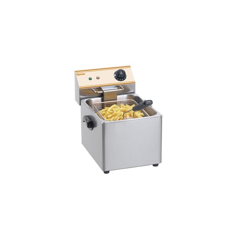Boîtier, couvercle, tableau de commandeen acier inoxydable1 cuve, 1 panier, contenance : 8 litresPuissance : 3,25 kW / 1 NAC 230 VL 265 x P 430 x H 340 mmThermostat de sécurité(protection anti-surchauffe)Poids : 7,1 kg