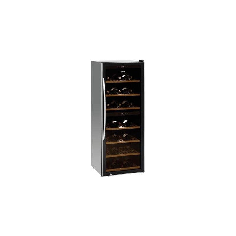 Avec son design élégant et son compresseur silencieux, le réfrigérateur àvin de qualité supérieure est parfait pour les bars et les restaurants.Couleur : Noir Type de vitrage : Double vitrage Verre trempé isolant avec filtre UV Nombre de zones de température : 2 Plage de température : En haut : 5 °C à 20 °C En bas : 5 °C à 20 °C Contenance : 313 litres (en haut : 138 litres, en bas : 175 litres) Contenance : 126 bouteilles (en haut : 54 bouteilles, en bas : 72 bouteilles) Thermostat : oui Nombre de tablettes intermédiaires : En haut : 3 En bas : 4 Type de tablette intermédiaire : Tablettes de conservation en bois À roulement à billes Sortant de 275 mm Dimensions des tablettes intermédiaires : 1 x L 505 x P 340 mm 6 x L 505 x P 440 mm Tablettes intermédiaires réglables en hauteur : non Affichage numérique : oui Commande : Tactile Électronique Réfrigérant : R600a Réfrigération : Compresseur Isolation : Thermique Classe de climat : ST Température ambiante : 16 °C à 38 °C Classe d'efficacité énergétique : B Consommation énergétique : 215 kWh / anFonction de décongélation automatique : oui Évaporation de l'eau de condensation : oui Ventilateur : Actif Verrouillable : oui Prêt à être monté : non Nombre de portes : 1 Butée de porte : À droite Butée de porte interchangeable : non Type de porte : Porte à battant, verre Peids réglables en hauteur : non Éclairage : LED Interrupteur de marche/arrêt : oui Puissance : 0.15 kWTension : 220-240 V Fréquence : 50/60 Hz Matériau : Acier Laqué Verre Convient à un usage professionnel continu : oui Remarque importante : - Largeur : 595 mmProfondeur : 625 mmHauteur : 1590 mmPoids : 76.05 kg