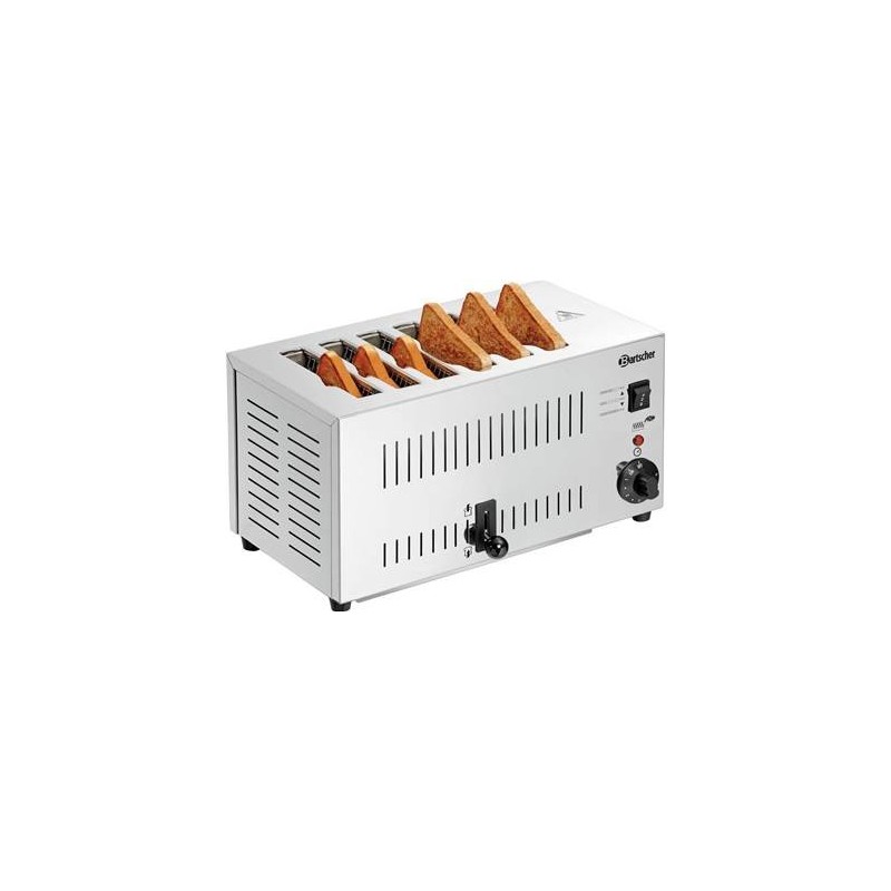 Un peu plus, pourquoi pas : 6 fentes avec sélecteurpour griller 2, 4 ou 6 tranches de pain de mie.Minuterie : oui Réglage de la durée de : 1 min.Réglage de la durée jusqu'à : 5 min.Fonctions : Toaster Nombre de fente : 6 Taille de fente : L 145 x P 20 x H 135 mm Conçu pour : Toast Sandwich grillé Nombre de niveaux de toastage : 0 Commande : 1 levier de commande pour 6 fentes (éjection manuelle) Bouton de sélection pour l'activation des fentes, groupes de 2 fentes Commande : Interrupteur à bascule Manette Levier Témoin lumineux de contrôle : Chauffe Propriétés : Tiroir à miettes, amovible Signal sonore lorsque le temps est écoulé Modèle : Toaster à fentes Compris : - Puissance : 2.5 kWTension : 230 V Fréquence : 50 Hz Matériau : Acier inoxydable Convient à un usage professionnel continu : non Remarque importante : - Largeur : 405 mmProfondeur : 265 mmHauteur : 220 mmPoids : 5.6 kg